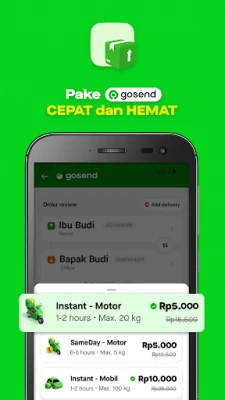 Tarvitsetko apua lähetyksen perille toimittamisessa? Gojekin GoSend varmistaa pakettien nopean ja turvallisen kuljetuksen vakuutusturvalla, taaten mielenrauhan lähetyksen saapumisesta ehjänä perille. Ja kun jääkaappi kaipaa täydennystä, GoMart tekee ruokaostoksista vaivatonta. Se hoitaa viikoittaiset ostokset puolestasi ja toimittaa ne kotiisi jopa 30 minuutissa, säästäen aikaasi ja energiaasi.