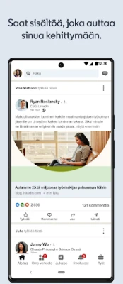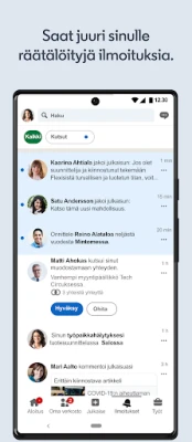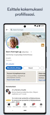 Hyödynnä LinkedInin kehittyneitä uratyökaluja ja räätälöityjä ilmoituksia, jotka ohjaavat sinua kohti juuri sinulle sopivia tehtäviä. Olipa kyseessä uusien projektien metsästys tai unelmiesi vakituinen työpaikka, profiilisi on valmiina auttamaan sinua erottumaan. Jaa asiantuntemustasi julkaisemalla artikkeleita, seuraa sinua kiinnostavia yrityksiä ja saa ensimmäisten joukossa tiedon avautuvista paikoista. LinkedIn on enemmän kuin sovellus – se on jatkuva kumppanisi urakehityksessä, tarjoten kaikki tarvittavat resurssit menestyäksesi alallasi.