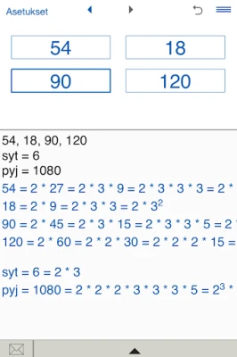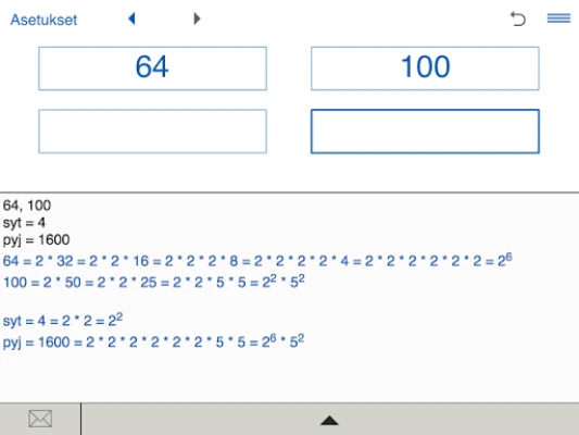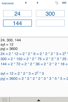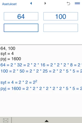 "SYT ja PYJ laskeminen" on suunniteltu huolellisesti auttamaan sinua hallitsemaan nämä keskeiset matemaattiset käsitteet. SYT:n avulla voit vaivattomasti supistaa murtolukuja pienimpään muotoonsa, selkeyttää lausekkeita ja ymmärtää paremmin lukujen yhteisiä tekijöitä. PYJ puolestaan on korvaamaton työkalu laskettaessa murtolukujen summaa tai erotusta, löydettäessä lukujen yhteisiä monikertoja tai ajoitettaessa toistuvia tapahtumia. Tämä sovellus tarjoaa intuitiivisen käyttöliittymän, joka tekee näiden arvojen määrittämisestä nopeaa ja luotettavaa, poistaen manuaalisen laskennan aiheuttamat virheet ja epävarmuuden.